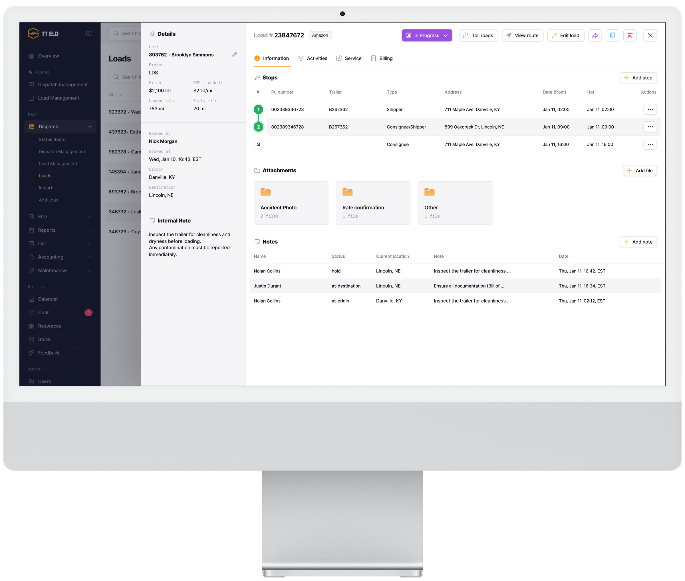The TT Loads App automatically generates arrival and departure confirmations at every stop, ensuring the back office stays updated on the driver's progress.